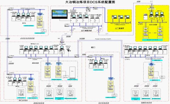 FCS field bus control system is used for plant-wide production process control. The number of control points in the whole plant exceeds 25,000 and the number of control circuits exceed 200. There are 1,138 FF field bus instruments and 75 wireless instruments. This project is the first in nonferrous industry as regards system sizing, number of FF field bus instruments and wireless instruments at present. Its technological and equipment level has reached international advanced level in the nonferrous industry. (4) Plant-wide control and production management system in Daye non-ferrous smelterDaye Nonferrous Metals Group Holdings Co. Ltd’s 300,000t/a copper smelter uses oxygen-enriched top-blowing AUSMELT smelting furnace - electric settling furnace - PS converter converting - rotary anode furnace refining - casting process. High temperature offgas enters waste heat boiler for heat recovery and the steam produced is used for power generation; SO2 offgas enters sulfuric acid system after dust collection.In order to improve the overall labor productivity of enterprise, advanced distributed computer process control system (DCS) is used for main workshops of the smelter – proportioning, AUSMELT smelting furnace workshop and waste heat boiler, acid-making workshop, power generation workshop and tank house.